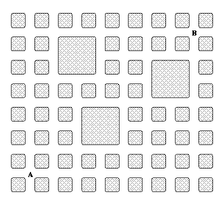 In the included postscript file [pictured below here] you see the map of a part of this city. How many shortest routes are there from A to B?